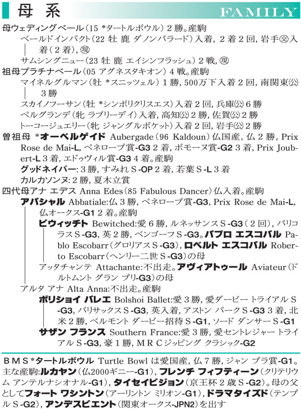 ●本馬のポイント 当クラブ所属のウェディングベールは、先行力と粘り強さを活かして2勝を挙げました。これまで芝向きの種牡馬と配合されてきましたが、この度父がダートのトップサイアーであるヘニーヒューズに替わったことで、一段と期待が高まる良駒が生まれました。胴回りに厚みのあるスケールの大きさを感じさせる馬体の持ち主で、後肢の踏み込みがとてもパワフルなので、ダートを主戦場に活躍してくれることでしょう。 父の産駒のイメージ通り、広いコースの1400〜1600m戦で余すことなく力を発揮するタイプと見ており、母譲りの勝負根性でライバル達を退け、勝ち星を量産してほしいところです。 ◇測尺 体高:154cm 胸囲:182cm 管囲:19.3cm *2025年11月時点 |