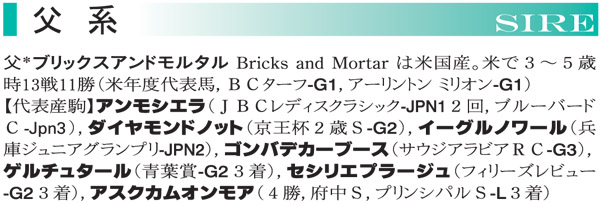 ●本馬のポイント 兄のブローザホーンは3歳夏に9戦目で初勝利を挙げると、類まれなる成長力とスタミナを武器に着実にステップアップし、5歳の6月にG1タイトルを手にしました。母のオートクレールも勝ち上がりに13戦を要しながらオープンまで駆け上がっており、文字通り大器晩成型の母系と言えるでしょう。 本馬はブローザホーン以来の待望の牡馬となります。父に迎えたブリックスアンドモルタルは5歳時に6戦6勝の成績を残してアメリカの年度代表馬に選出された、身体能力、成長力ともに文句なしの超一流馬です。この馬もとても均整の取れた体形で、強いバネも感じられるので、兄に続く大活躍を期待しています。 ◇測尺 体高:153cm 胸囲:171cm 管囲:20.0cm *2025年11月時点 |