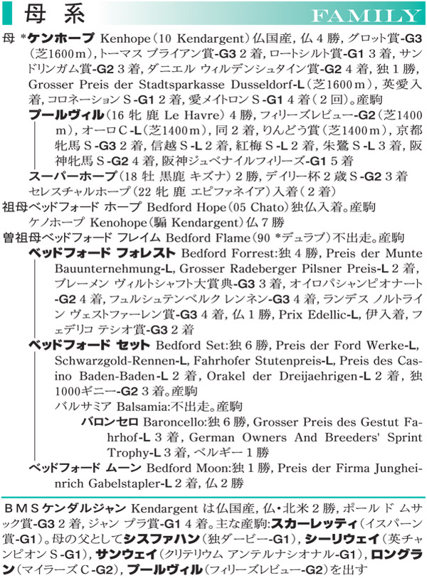 ●本馬のポイント 母は欧州のマイルG1戦線で首位争いを演じた実力馬で、産駒のプールヴィルがフィリーズレビューを制しており、繁殖馬としても実績を残しています。 本馬は体を大きく使ったリズミカルな歩様を見せており、洗練された身のこなしからは大物の風格が漂っています。トレーニングに取り組む姿勢がとても実直なので、負荷を掛ける毎にグンと力を付けていきそうです。父は次々にG1馬を送り出すキタサンブラックですから、自ずと王道の芝中距離戦での大活躍に期待が懸かります。ターフで鮮やかな末脚を発揮する姿が想像でき、タイトルをいくつ奪取してくれるか今から楽しみでなりません。 ◇測尺 体高:160cm 胸囲:177cm 管囲:19.5cm *2025年11月時点 |