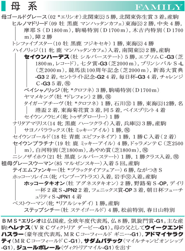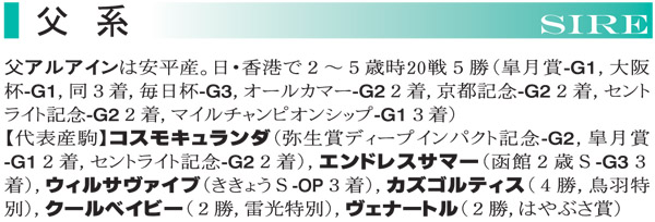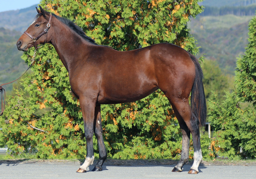 ●本馬のポイント 父アルアインは2歳10月の新馬戦で518キロでデビューするとマイル戦で連勝。5戦4勝で皐月賞を制しました。その後は2000m前後の距離で堅実に走り、大阪杯で2つめのG1タイトルを手にしています。ディープインパクトの産駒にしては大柄で、瞬発力よりも総合力で勝負するタイプであったこともあり、産駒も同じような傾向があります。 本馬も5月生まれの牝馬ながら既に立派な体格を誇っており、ゆくゆくは牡馬顔負けの馬っぷりで、豊富なスタミナを武器に芝の中距離で活躍してくれそうです。中央の上級馬が多数出ている優秀な牝系というのも心強く、確実性、将来性ともに大いに期待できる1頭です。 ◇測尺 体高:155cm 胸囲:181cm 管囲:20.0cm *2025年11月時点 |