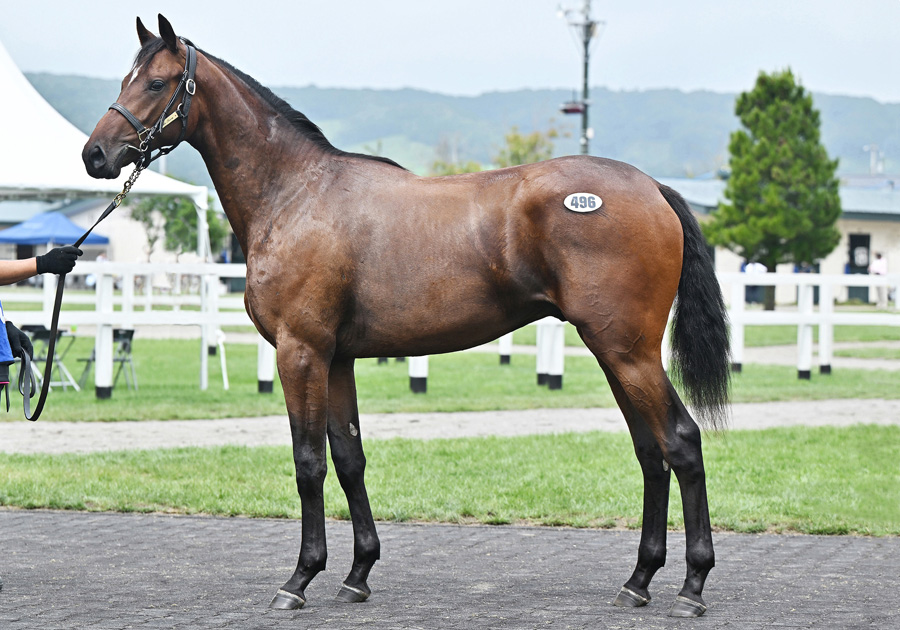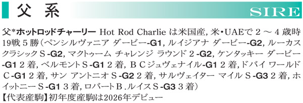 ●本馬のポイント 父はダートのトップクラスのレースで好走を続け、2023年に社台スタリオンSで種牡馬となりました。G1勝ちこそ1つですが、3歳時のハスケルS・G1では降着となったものの、ケンタッキーダービー馬を差し切って1位で入線しており、世代屈指の実力を示しました。産駒はいかにもダート馬といったパワータイプよりも芝の中距離でも走れそうな軽快さを備えた子が多い印象です。 本馬も、母の父として芝の一流馬を輩出するハードスパンの血が入っていることもあって脚長でシャープな体形をしており、身のこなしも実に俊敏です。芝の2000m位の距離でスピードを武器に押し切る姿が容易に目に浮かびます。 ◇測尺 体高:158cm 胸囲:183cm 管囲:20.5cm *2025年11月時点 |