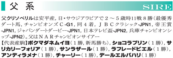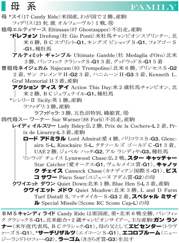 ●本馬のポイント 母は米G1・6勝のガンランナーを輩出したキャンディライドの直仔で、兄に米チャンピオンスプリンターのドレフォンがいる良血馬です。現役時はJRAのダート1200m戦で2勝を挙げました。父クリソベリルはダートで圧倒的な身体能力を見せ、デビューから6連勝でチャンピオンズCを制すと、その後もG1馬達を完封しました。 両親からパワーを十分に受け継いだ本馬は、砂の舞台での素質開花が期待されます。前向きな気性で、調教では全身を一杯に使った走りが一際目立っており、小回りコースも合いそうなので、スプリント戦でスピードとパワーを存分に発揮して勝ち星を積み上げてくれることでしょう。 ◇測尺 体高:153cm 胸囲:178cm 管囲:20.0cm *2025年11月時点 |