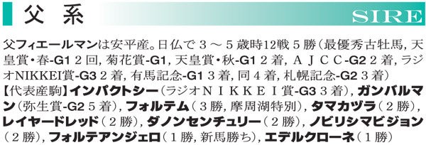 ●本馬のポイント 父は長距離G1・3勝を果たすとともに、天皇賞・秋でも勝ち馬アーモンドアイに迫り、1分57秒9のタイムで2着となりました。スタミナだけでなく持続性の高いスピードを兼備していることを証明し、産駒の勝ち星も約7割が芝1500〜 2000m戦でのものとなっています。母は南米の年度代表牝馬を送り出した優秀な牝系の出身で、中央の4勝馬を2頭送り出しており、繁殖馬として堅実な成績を収めています。 本馬は小気味のいい脚捌きが印象的で、小回りコースも難なくこなしそうです。学習能力が高い優等生タイプで、芝のマイル〜中距離の舞台でどれだけのパフォーマンスを見せてくれるか楽しみでなりません。 ◇測尺 体高:153cm 胸囲:180cm 管囲:19.5cm *2025年11月時点 |