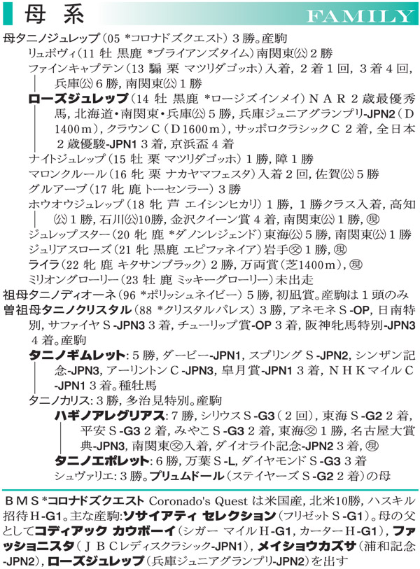 ●本馬のポイント 母は種牡馬の長所を引き出して様々な産駒を送り出す優秀な繁殖馬です。地方ではローズジュレップが2歳最優秀牡馬に輝き、中央では3頭の子ども達が芝で勝利を挙げています。 父は北米の芝のG1を5勝した一流馬で、本馬も芝での活躍が楽しみな1頭です。父譲りのバランスの良い骨格に、胸前や後肢など豊富な筋肉を纏っていて、ベースの高さが窺えるので、これからのトレーニングで桁違いの変貌を遂げるかもしれません。1600〜1800mの距離を中心にコースを問わず力を発揮できるタイプと見ており、完成された際には父のように一気に白星を積み重ね、上まで突き抜けていくのではないかと期待しています。 ◇測尺 体高:153cm 胸囲:179cm 管囲:19.0cm *2025年11月時点 |