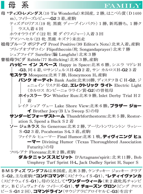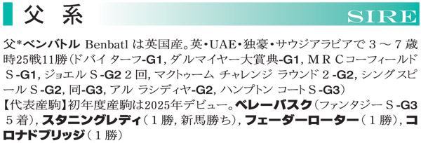 ●本馬のポイント 父は3か国で芝のマイル〜2000mのG1を制しただけでなく、ダートのサウジCでも2着と好走したように、様々なコースで高い能力を発揮しました。今年デビューを迎えた初年度産駒も続々と勝ち上がっています。 母はダートの1400m戦で2勝し、桜花賞TRでも3着となった実力馬です。サンデー系の種馬との相性が良くないのか、まだ期待ほどの子を出していませんが、ベンバトルを父に迎えた本馬が一気に飛躍しても不思議ではありません。柔らかな歩様からは芝のマイル〜中距離での活躍が想像できますが、米国血統のパワーが色濃く出てくるようなら、両親のような二刀流の走りを披露してくれるかもしれません。 ◇測尺 体高:153cm 胸囲:175cm 管囲:20.3cm *2025年11月時点 |