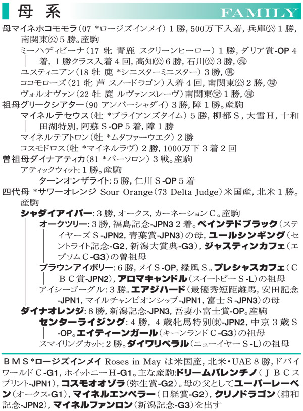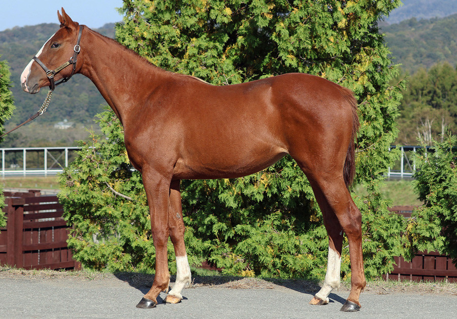 ●本馬のポイント 父は3歳時に5連勝でNHKマイルCを制しましたが、本格化は現役最終年の5歳になってからで、同年は短距離G1オール連対で最優秀短距離馬に輝きました。産駒は特に牝馬の活躍が目立っており、重賞6勝のメイケイエールや7億円近くの賞金を獲得しているナムラクレアなど、強烈な個性を持ったトップスプリンターが短距離路線を賑わせています。 本馬はダート1000mで3勝を挙げ、3勝クラスで首位争いを演じているユスティニアンの妹となります。均整の取れた体形と機敏な身のこなしからは高いスピード能力が見て取れ、父系、母系ともに成長力に富むことから、芝の短距離での大活躍を期待しています。 ◇測尺 体高:155cm 胸囲:175cm 管囲:19.0cm *2025年11月時点 |