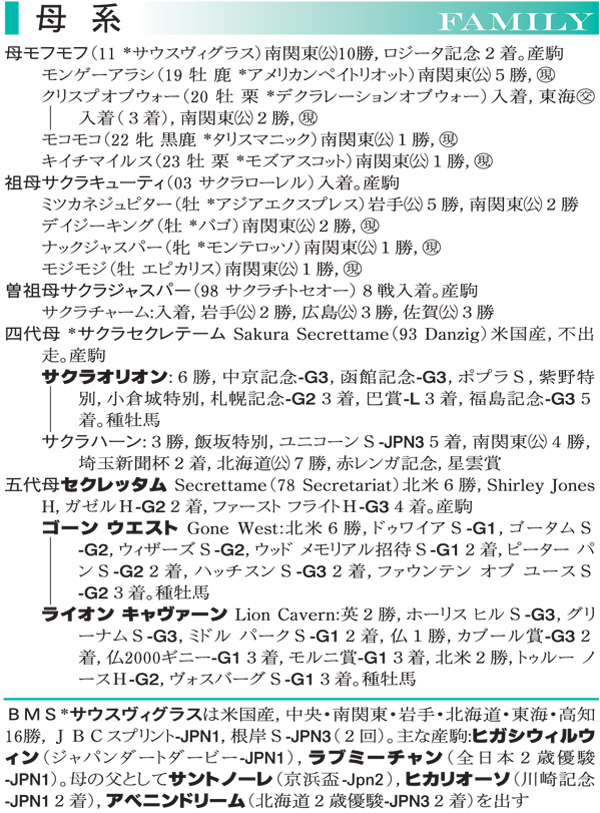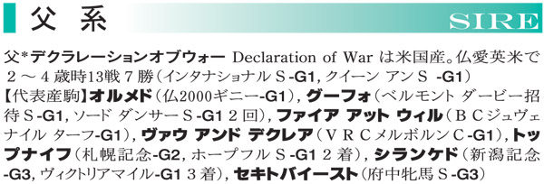 Danzig 3S×5D, Blushing Groom 4S×5D, Mr. Prospector 5S×5D, Secrettame 5S×5D