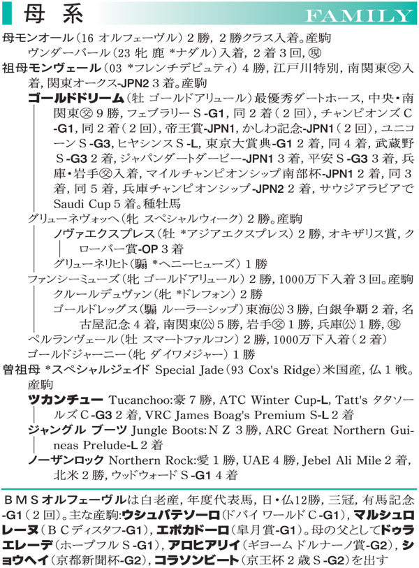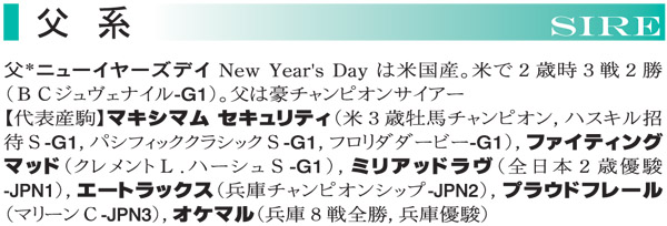 ●本馬のポイント 母は当クラブの所属馬として、ダート中距離戦で2勝を挙げて繁殖入りしました。初子のヴンダーバールは今年7月にデビューし、2着3回と勝ち上がり目前のところまで来ています。父ニューイヤーズデイは日本に導入後は、これまで全日本2歳優駿勝ちのミリアッドラヴやダートグレード競走2勝のエートラックスなど、ダートのトップホースを輩出しています。 本馬はボリューム満点の体つきで後肢の踏み込みも実に力強く、かなりのパワーの持ち主であることが窺えます。活躍の舞台はダートの中距離戦になると見ており、圧倒的な末脚を発揮して、ライバルを抜き去るシーンを何度も見せてくれるはずです。 ◇測尺 体高:155cm 胸囲:180cm 管囲:21.5cm *2025年11月時点 |