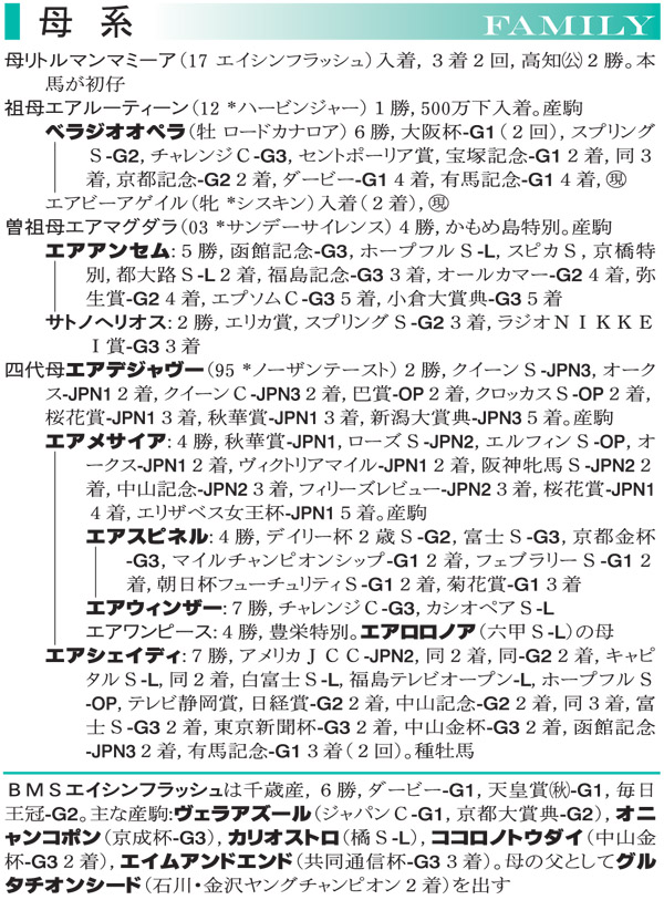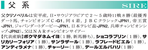 ●本馬のポイント 父はチャンピオンズCでゴールドドリームとの接戦を制し、ファインモーション以来となる3歳で無敗のまま古馬混合G1優勝という偉業を達成しました。今年デビューを迎えた初年度産駒は順調に白星を挙げており、父と同じく連勝街道を突き進む馬の登場が期待されます。 本馬は大阪杯連覇のベラジオオペラを始め、重賞ウィナーが多数いる厚みのある母系の出身なので、十分な底力を秘めていそうです。調教では元気溌剌と疲れ知らずにメニューをこなし、体力自慢の一面を覗かせています。やればやるほど伸びてきそうで、ダートのマイル〜中距離戦でレースを重ね、どのような成長曲線を描くか楽しみな1頭です。 ◇測尺 体高:150cm 胸囲:173cm 管囲:20.0cm *2025年11月時点 |