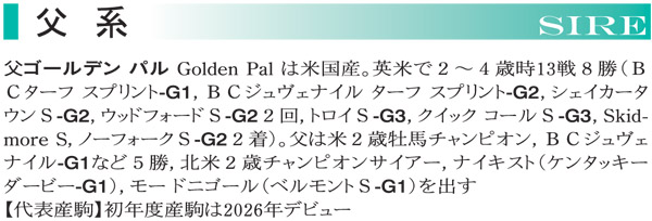 ●本馬のポイント 父はBCジュベナイルターフスプリント、BCターフスプリントを制したスピードスターです。米国の芝の重賞レースでは8戦7勝と無類の強さを誇りました。母も米国の芝短距離戦でG3勝ちを含む通算10勝を挙げた快速馬です。 本馬は筋肉質な体が目を惹き、踏み込みの力強い歩様からはパワータイプの印象を受け、砂の舞台で頭角を現すと見ています。母の父トワーリングキャンディは、BMSとして日本のダートで実績を挙げている点も適性の裏付けとなりそうです。両親から受け継いだスピードを余すことなく発揮して、2歳戦からスプリント路線で圧巻のパフォーマンスを見せてほしいところです。 ◇測尺 体高:159cm 胸囲:177cm 管囲:20.0cm *2025年11月時点 |