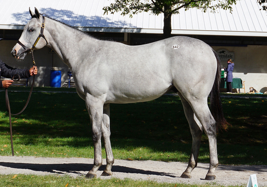 ●本馬のポイント 父タキトゥスはG1タイトルこそないものの、堅実な走りで何度も1番人気に推された実力馬でした。4着となったサウジカップには日本代表としてゴールドドリームとクリソベリルが出走しており、それぞれ5、6着で入線。その2頭は3か月前のチャンピオンズCの1、2着馬であることから、父にも同等以上の価値があると言えるでしょう。 母はアメリカのダートの短距離戦で7勝を挙げた快速馬であり、本馬の大きく発達した後躯や深い胸からは、やはりスプリント戦向きの爆発的なスピードとパワーが期待できそうです。オープンで活躍中のエティエンヌの1歳時に良く似ているので日本への到着が楽しみです。 ◇測尺 体高:159cm 胸囲:189cm 管囲:21.0cm *2025年12月時点 |